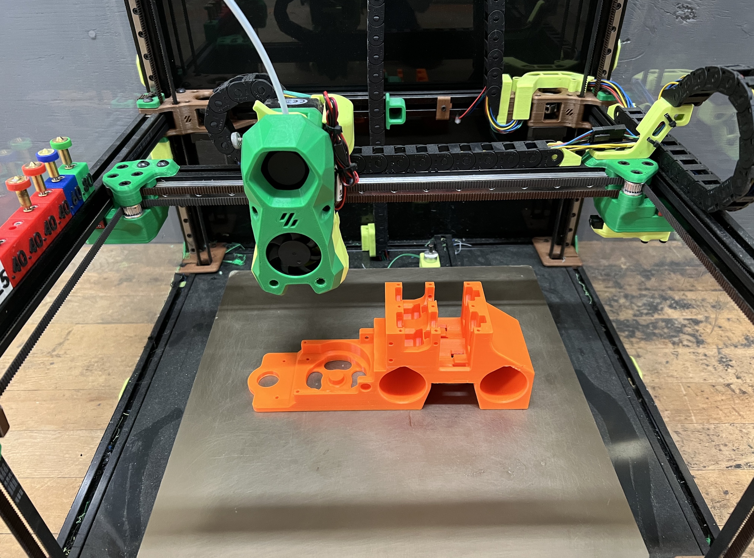 This is my Voron 2.4, an open source 3D printer. I built this printer to solve some shortcomings of my previous printer, my Prusa Mk3. My Prusa made excellent PLA & PETG parts, but it did it slowly and did not do well with other materials. The Voron matched the part quality of the Prusa, but could printer larger parts and with more materials. Particularly the printer could print compliant materials and thermally sensitive materials reliably. I also implemented resonance compensation on the printer, which allowed it to print more than double the speed of my Prusa, at the same quality.